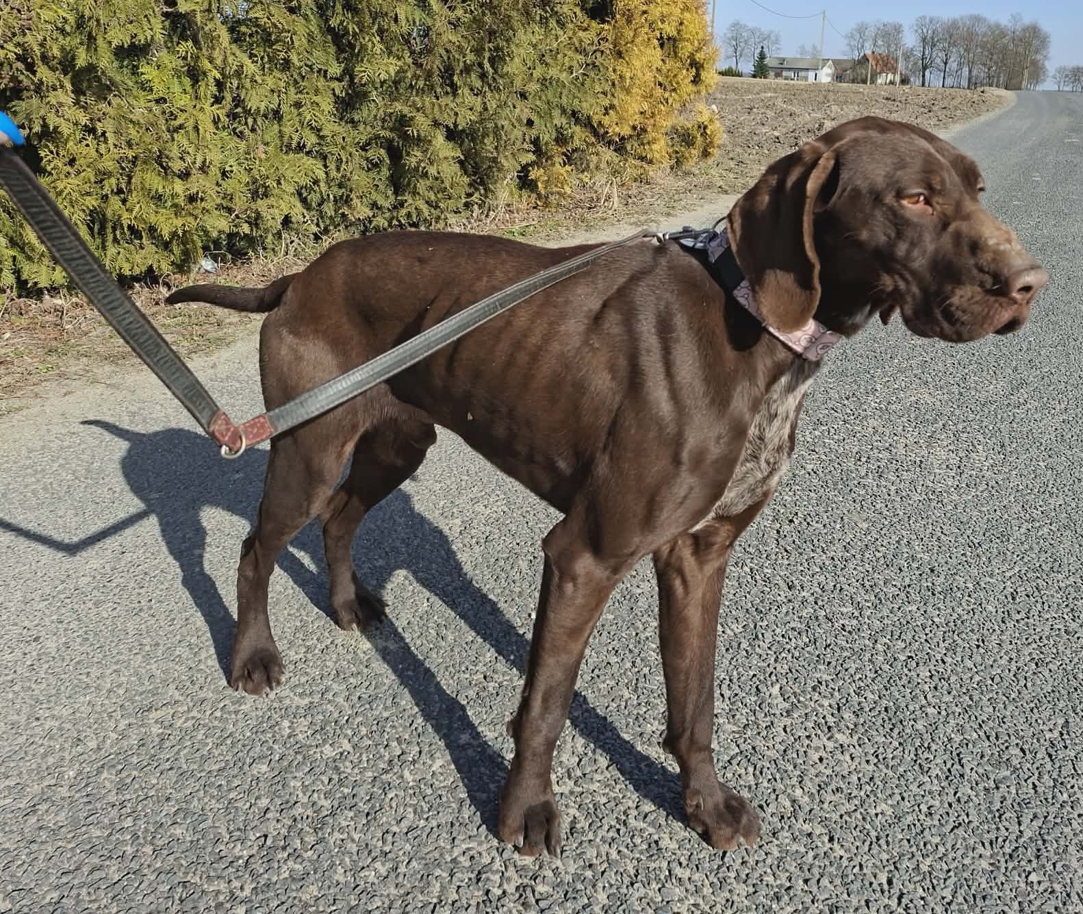 Lindor to młody wyżeł, który jeszcze niedawno żył na krótkim, około 1,5-metrowym łańcuchu – bez budy, bez schronienia, wśród śmieci, ostrych przedmiotów i odchodów. Nie miał stałego dostępu do wody ani jedzenia. Jego jedynym sposobem, by choć trochę uciec od błota i wilgoci, było wchodzenie na dach prowizorycznej, skleconej z byle czego szopy. Stamtąd próbował zobaczyć cokolwiek poza zasięgiem łańcucha.