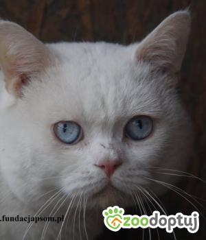Biały to około dwu letni kot w typie Brytyjczyka. Biały potrzebuje bardzo dużo czasu na nawiązanie relacji z człowiekiem, jest bardzo ostrożny w kontakcie z opiekunem. Obecnie jest razem z innymi kotami w domku i nie zauważyliśmy agresji lub niechęci do nich z jego strony. Potrzebny jest nowy właściciel z dużą cierpliwością, nie nachalnością . Potrzebujemy człowieka, który zagwarantuje Białemu spokój i czas na resocjalizację. Pilnie potrzebujemy domu w którym kotek będzie mógł się otworzyć na nowo i zapałać miłością do nowych opiekunów.