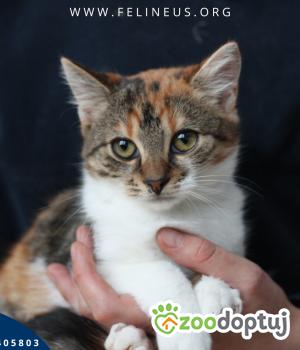 Farcia to urocza, kolorowa koteczka, urodzona w lipcu 2025 roku. To druga kicia z kolorowego teamu. W domu tymczasowym pieszczotliwie zwana Baby. Dlaczego Baby? Ponieważ legendy o jej słodkości będą opowiadane następnym pokoleniom znajdek. Jest miodem dla lubujących się w głaskaniu kotków. Jej puch zdecydowanie znajdzie fanów.