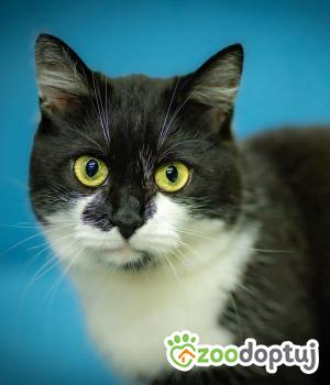 Ma elegancki czarno-biały futerek, spojrzenie, które przenika aż do duszy, i… ogromne pragnienie kochającego domu. Ma dopiero 4 lata – w kocim świecie to idealny wiek, by rozpocząć nowy rozdział.