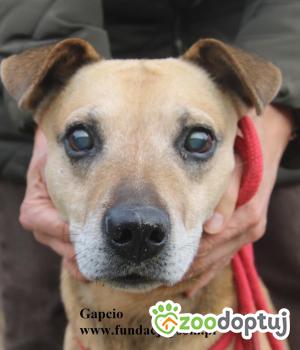 Gapcio to psiak o przeuroczym, pogodnym charakterze, niemożliwa przylepa, wielbiciel człowieka i innych psów. Łasi się, przytula, szuka przewodnika, jest psem niedowidzącym - ma bielmo na oczach. Doskonale radzi sobie na smyczy, nie szarpie. Szukamy domu dla Gapcia z wiarą, że jego niedoskonałość nie przyćmi cudownego charakteru i wielkiej potrzeby bycia przy człowieku. Domek potrzebny bardzo.